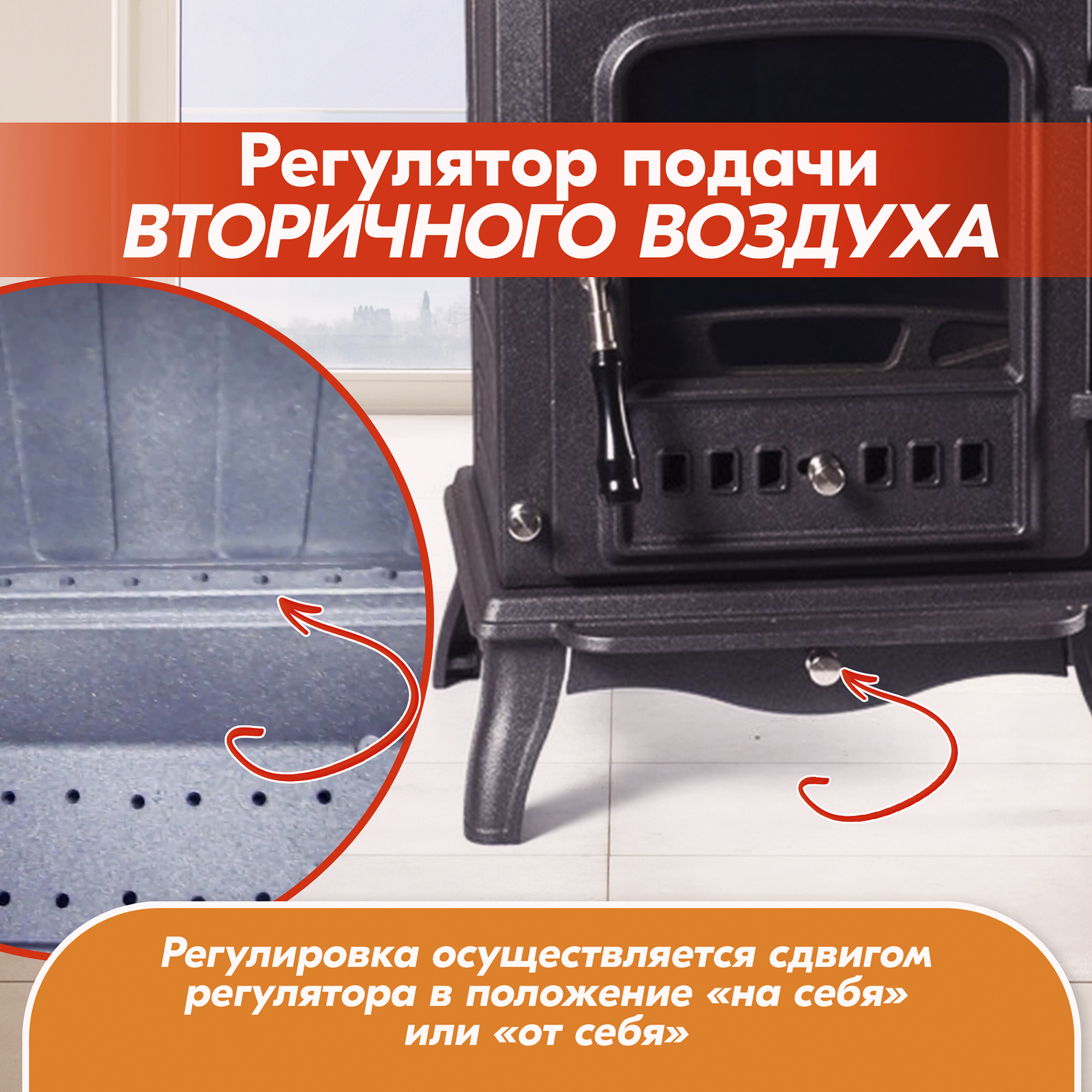 Чугунная конструкция печи-камина гарантирует прочность, долговечность и износостойкость на долгие годы использования.