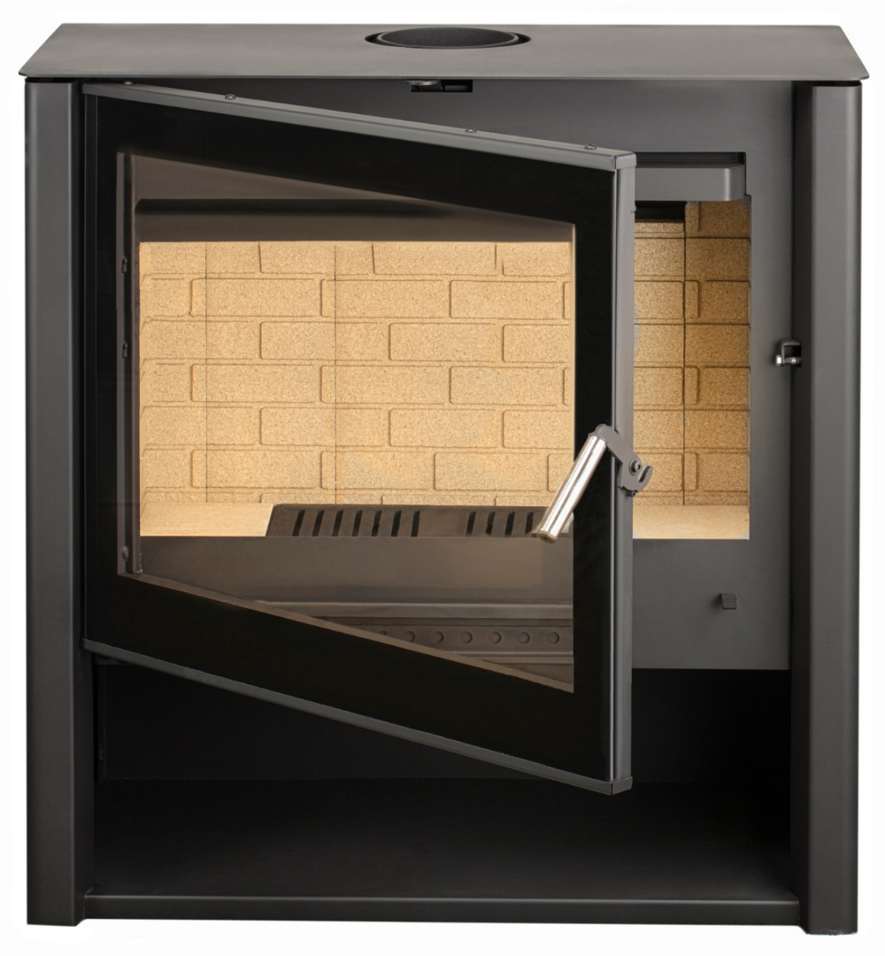 Пристенная печь с оригинальным и лаконичным дизайном. Большая плоская топочная дверка. Идеально подходит для обогрева помещения, выполненного в современной стилистике площадью 45-90 м2. Размер поленьев 30 – 60 см.