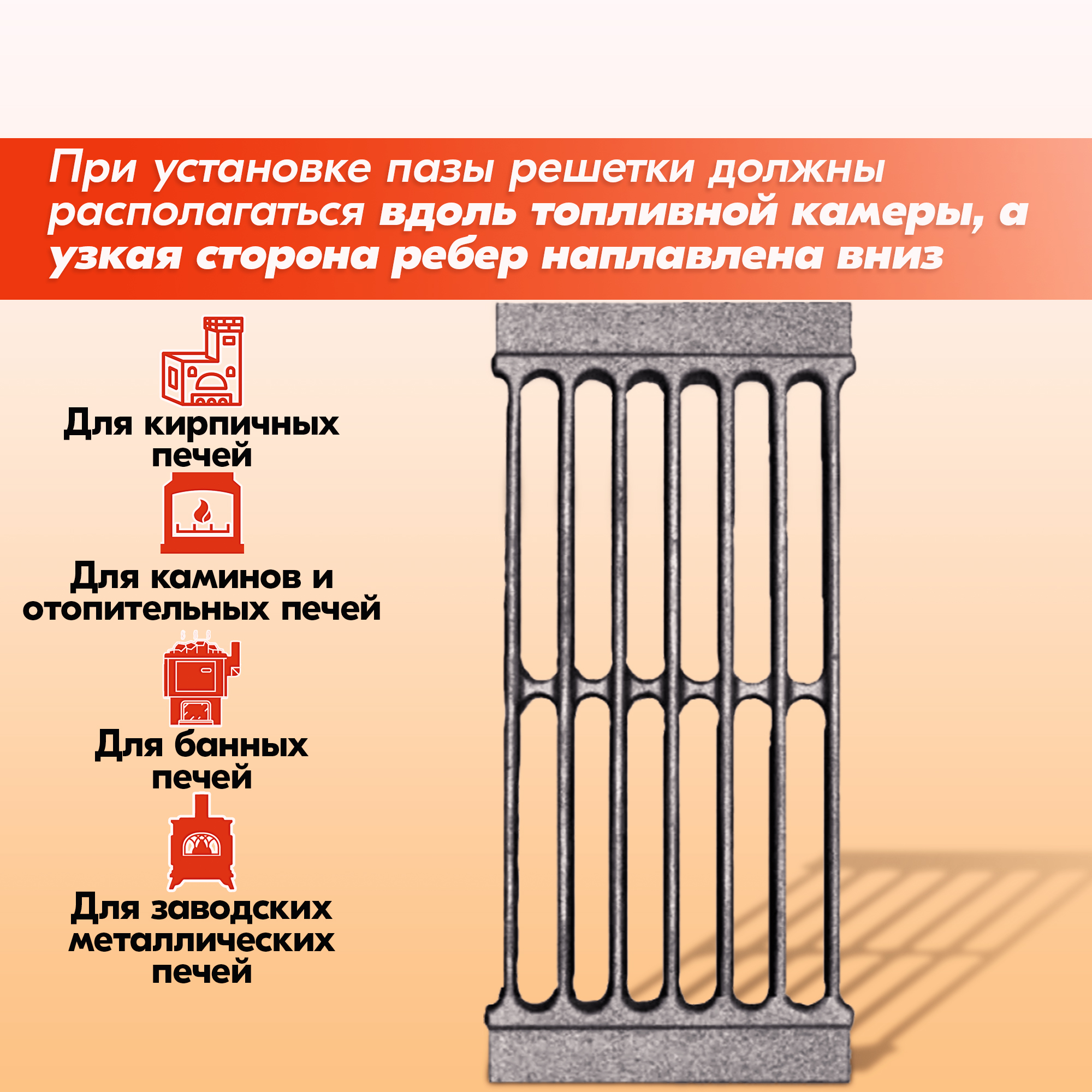 Располагать решетку колосниковую в топке обязательно узкой стороной ребер вниз, иначе срок её службы значительно снижается.