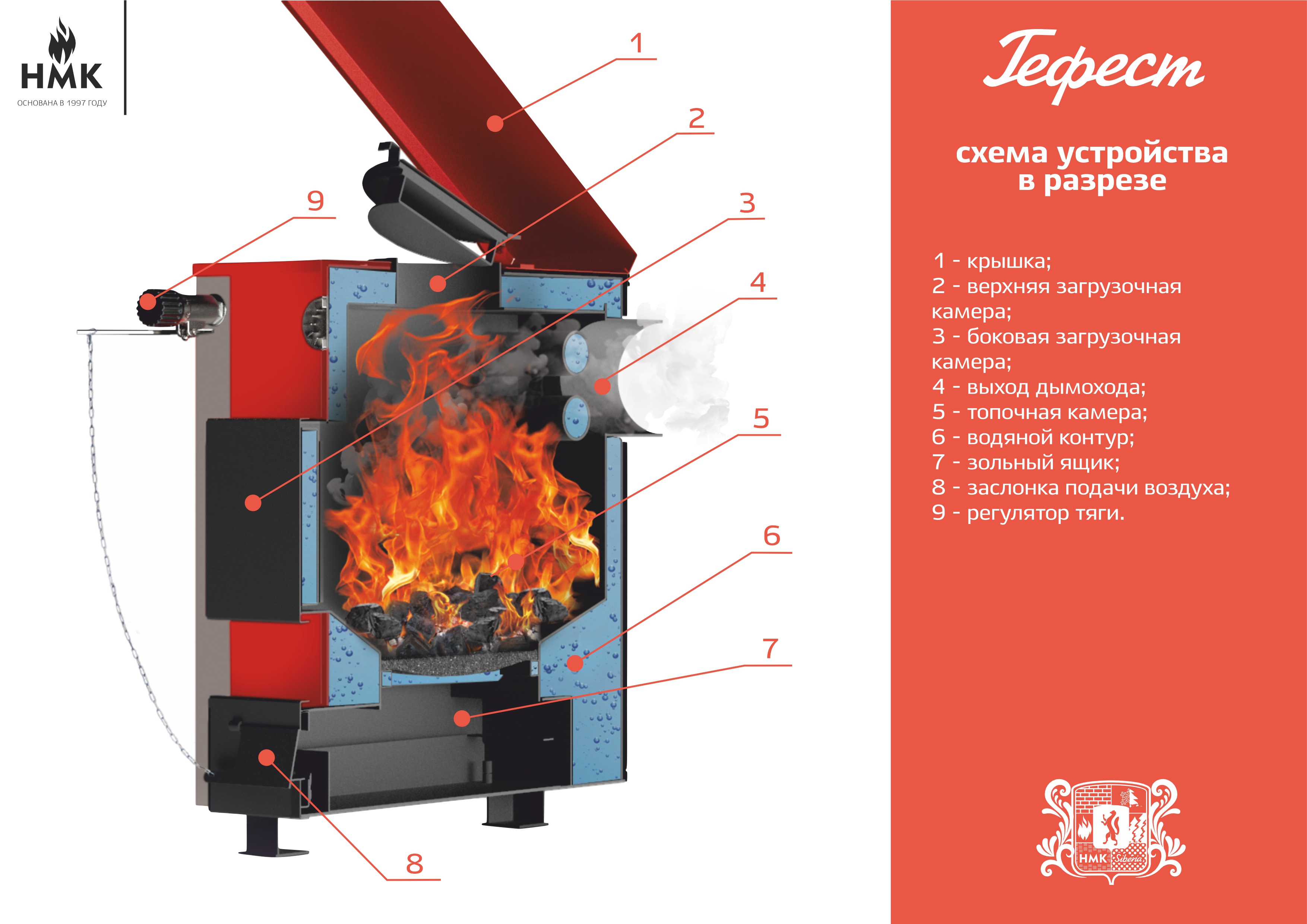 Для автоматического управления подачей воздуха в камеру сгорания на дверце зольника установлена воздушная заслонка, через цепочку управляемая энергонезависимым терморегулятором. В верхней части котла "Гефест" 30 кВт имеется загрузочный люк, который облегчает работу по закладке топлива в топочную камеру.
