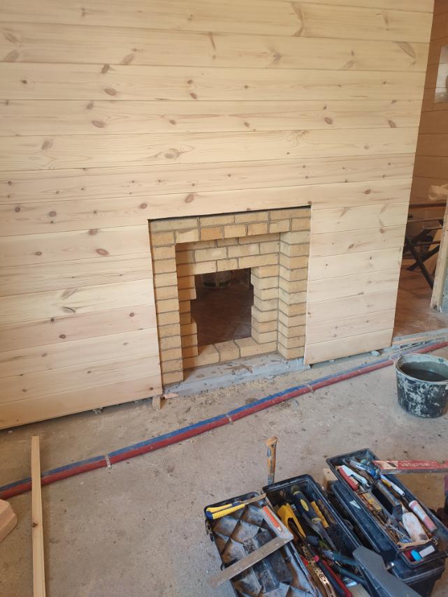 Монтаж печи Атмосфера с установкой коплекта дымохода и кирпичного портала.